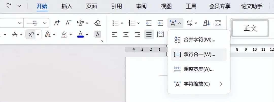 1.点击【开始】→【中文版式】,选择【双行合一】。