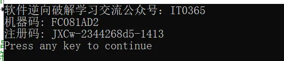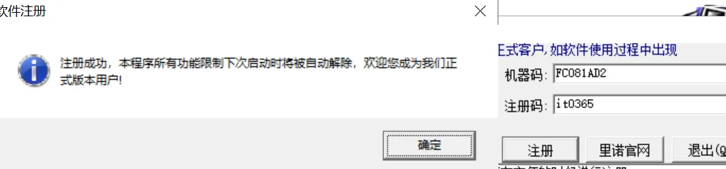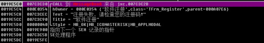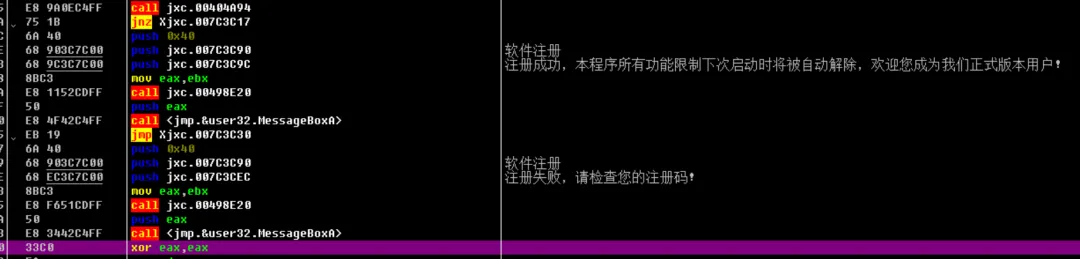 007C3BFA /75 1B jnz Xjxc.007C3C17007C3BFC |6A 40 push 0x40007C3BFE |68 903C7C00 push jxc.007C3C90 ; 软件注册007C3C03 |68 9C3C7C00 push jxc.007C3C9C ; 注册成功,本程序所有功能限制下次启动时将被自动解除,欢迎您成为我们正式版本用户!007C3C08 |8BC3 mov eax,ebx007C3C0A |E8 1152CDFF call jxc.00498E20007C3C0F |50 push eax007C3C10 |E8 4F42C4FF call <jmp.&user32.MessageBoxA>