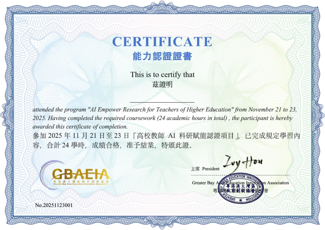 完成3天全部培训课程并通过成果考核后,将获得由本次培训组织方提供的“高校教师AI科研赋能认证项目证书”,证书可作为学校师资培训、教师个人学术能力提升的重要证明,为学术履历增添亮点。