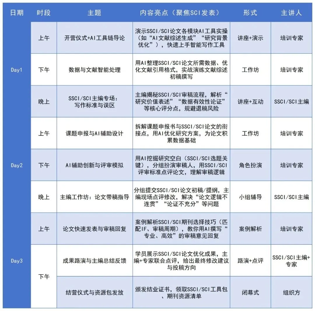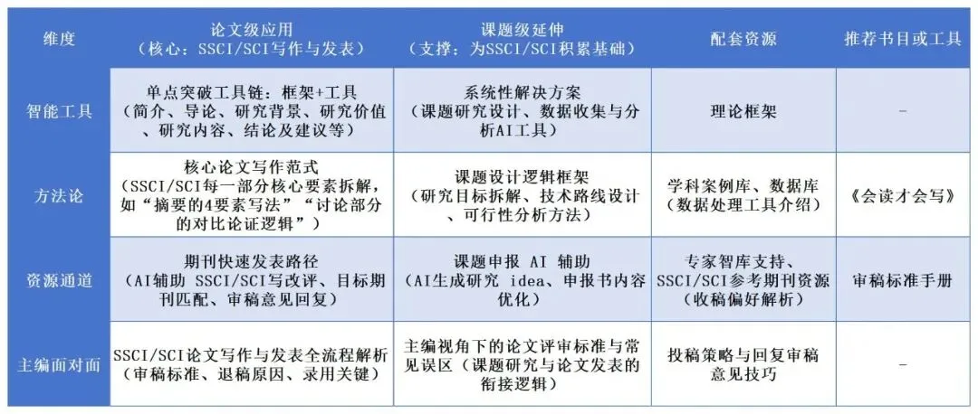 本次培训围绕“SSCI/SCI发表”核心目标,从“智能工具、方法论、资源通道、主编面对面”四大维度设计内容,覆盖论文与课题全场景,确保所学即所用: