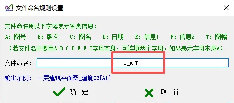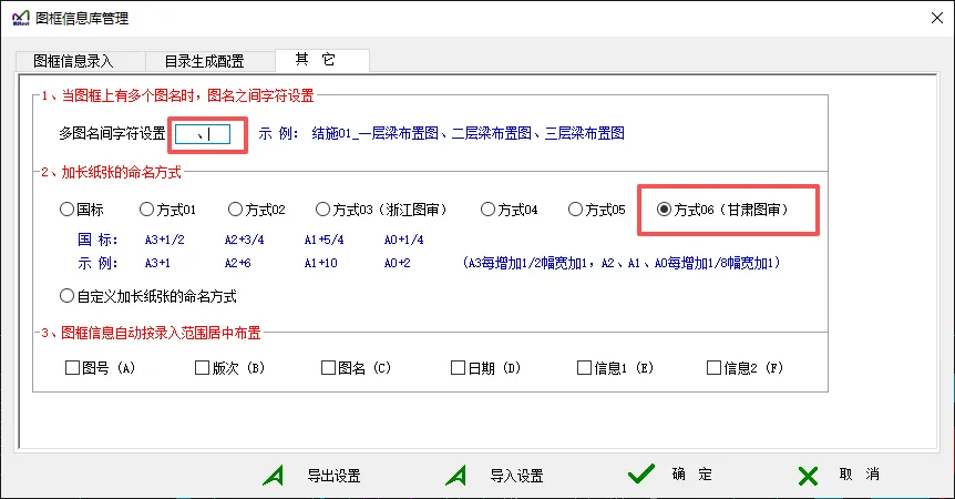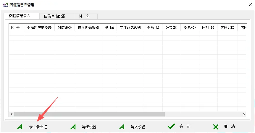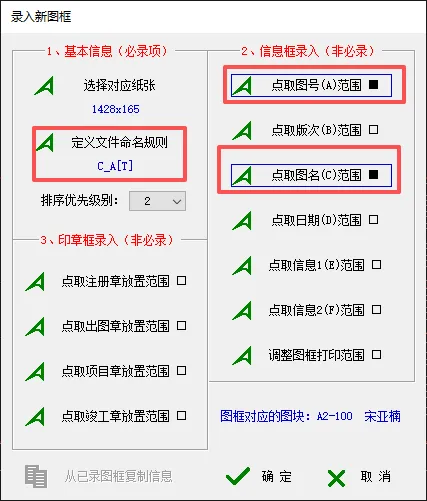 选择图框的图块,图框也支持动态块。然后弹出《录入新图框》,在里面依次设置图号范围、图名范围、文件命名规则。注意文件命名规则英文字母要大写。