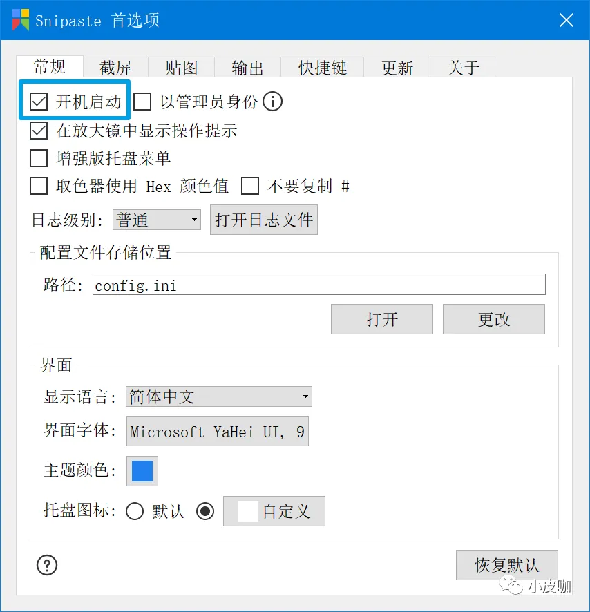 温馨提示:可以在首选项设置中开启“开机自启”,这样就方便截图操作,反正占内存也不大!