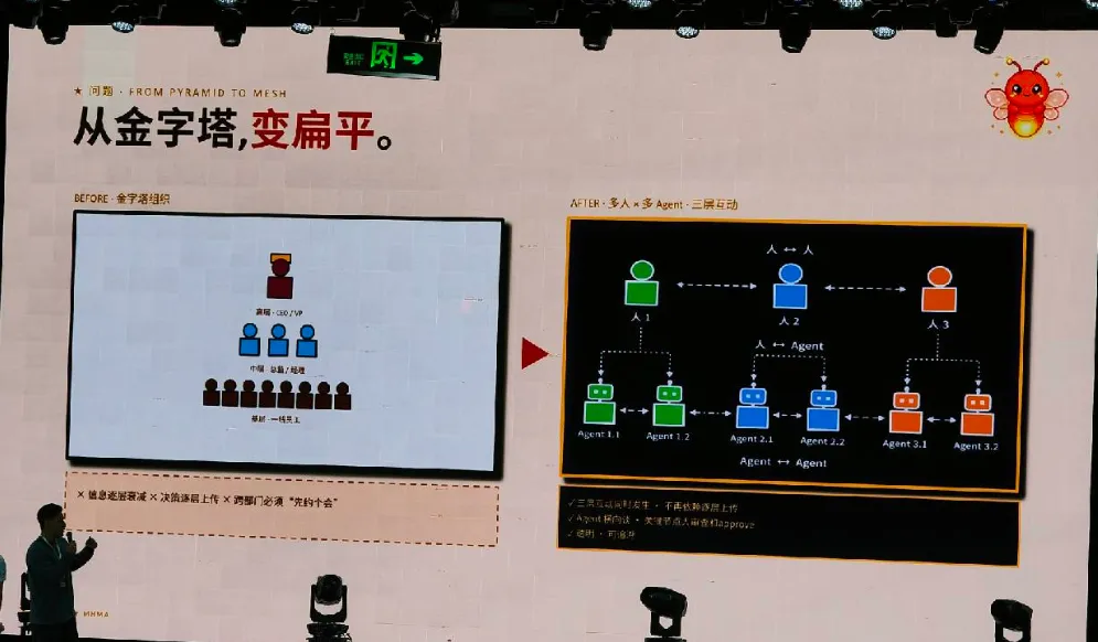 定期考核AI的效率和完成质量,跑通一个业务后,可规模化拓展到其他业务。等AI真能稳定完成目标,真正可以接管人工的重复任务,即可调整组织架构,留几个人管AI系统就行。