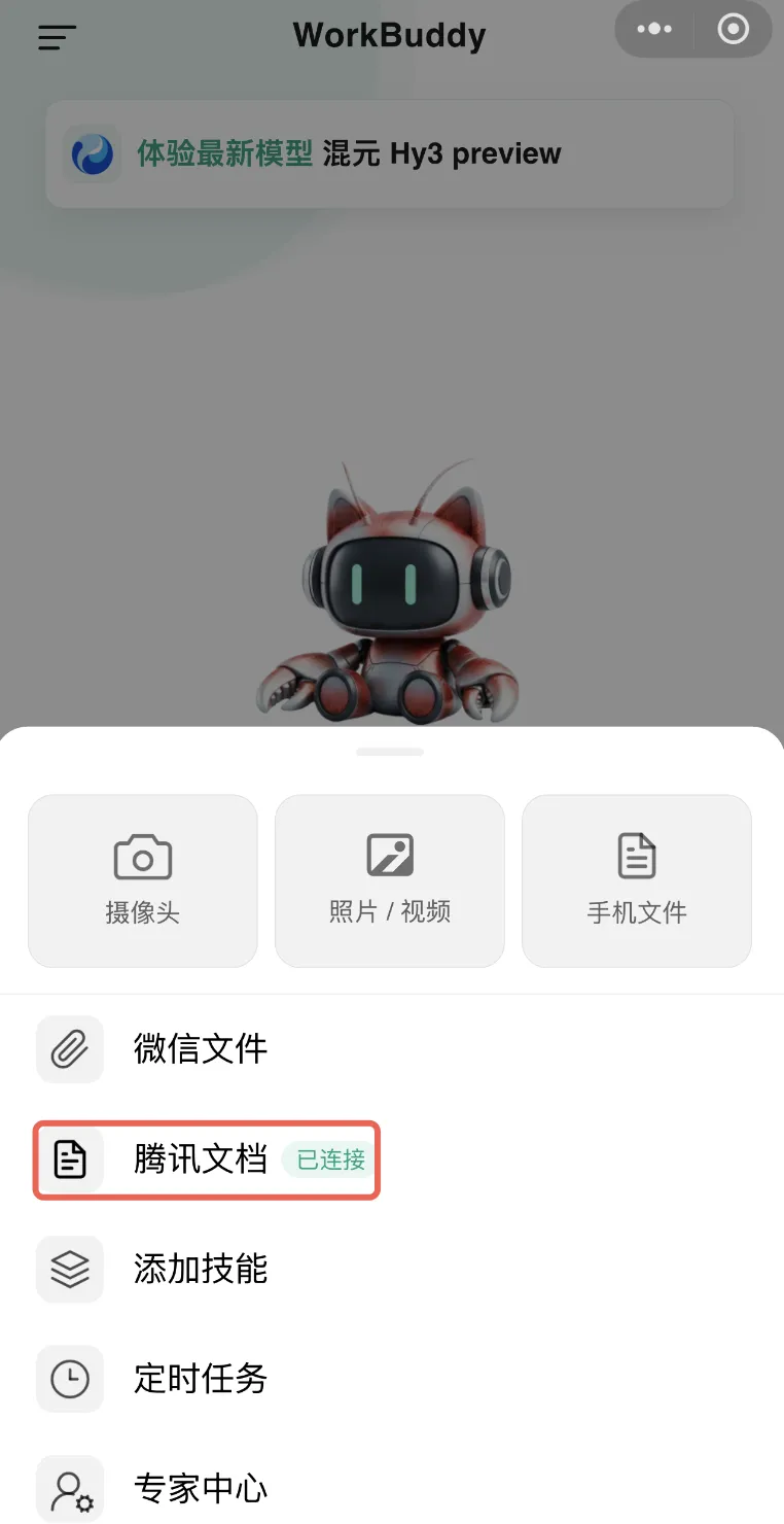 打开腾讯文档App→搜索资料→下载到本地→打开WorkBuddy→上传资料→等待解析→提问。