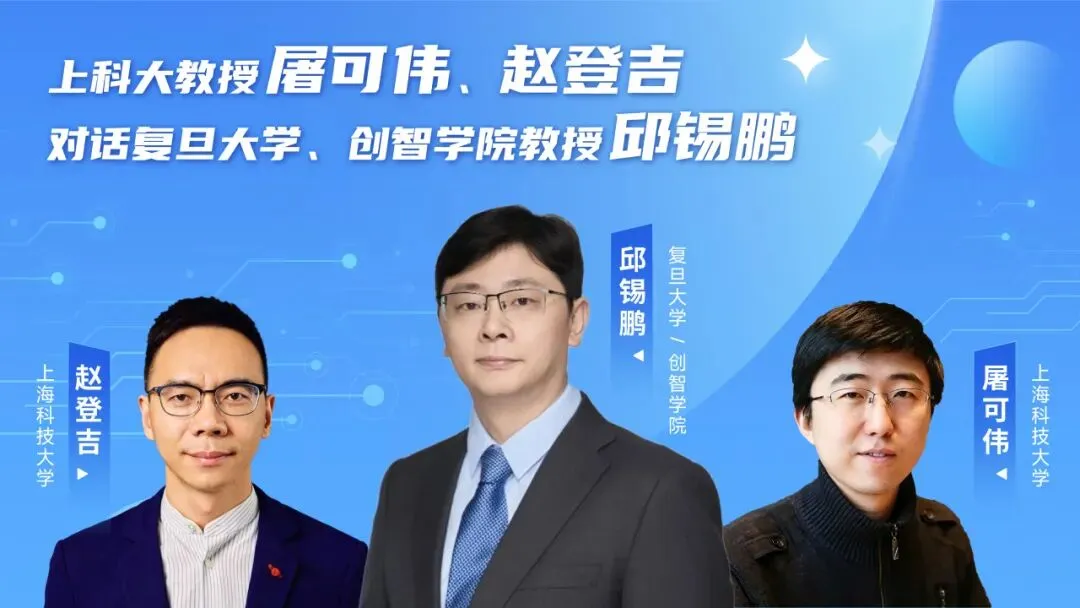 本场座谈,我们特别邀请到复旦大学特聘教授、上海创智学院院长助理邱锡鹏教授,与上海科技大学信息学院赵登吉教授、屠可伟教授围炉共话。座谈将围绕大模型前沿进展、智能体技术探索、开源生态建设以及青年学者的成长路径等话题展开深度交流。三位学者将从各自的研究视角与实践经验出发,分享洞见、碰撞思想,为在场师生带来一场兼具学术深度与温度的对话。