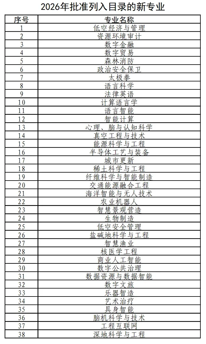 《普通高等学校本科专业目录(2026年)》已发布,共新增38种普通高校本科新专业。其中涵盖低空经济、脑机科学、具身智能、深地工程、农业机器人、数字文旅等一众前沿领域。