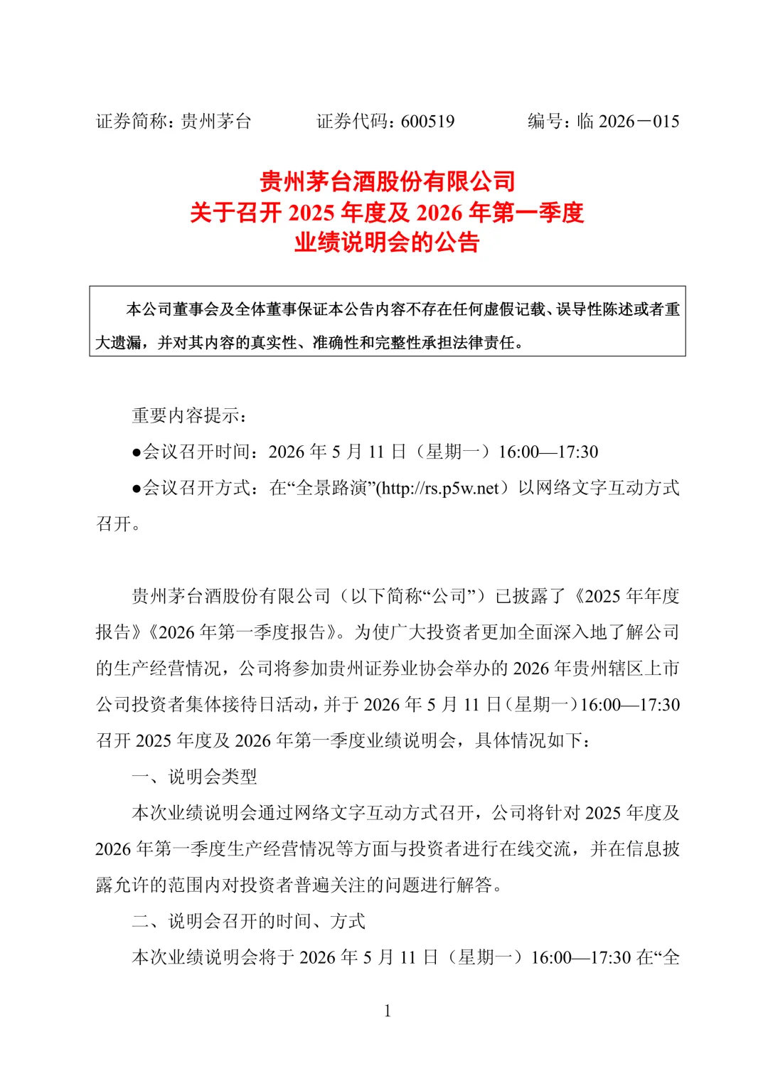 4月28日,贵州茅台发布公告称,将于2026年5月11日(星期一)16:00—17:30,在“全景路演”(http://rs.p5w.net),以网络文字互动方式,召开2025年度及2026年第一季度业绩说明会,就生产经营情况与投资者进行在线交流。
