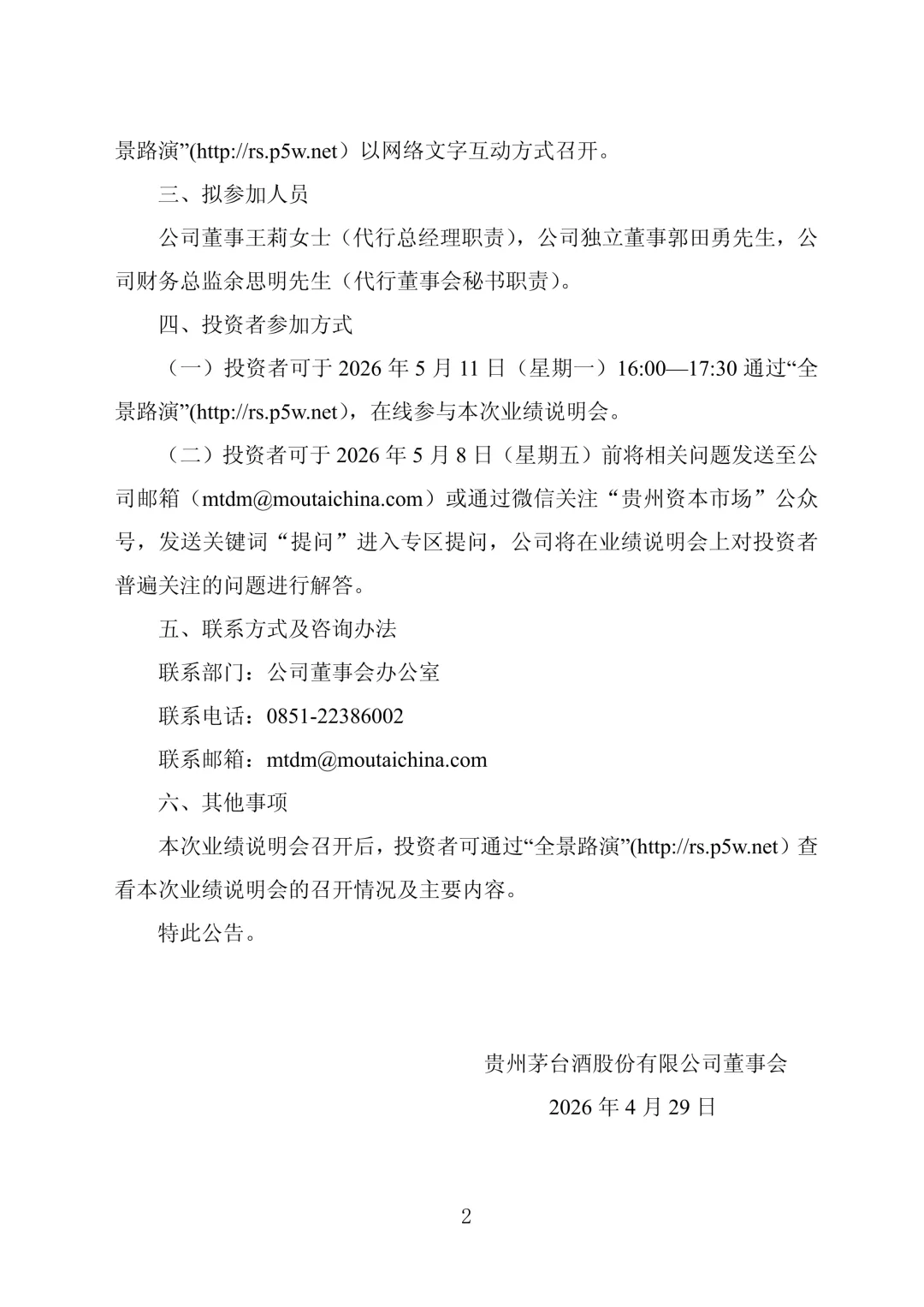 公告显示,投资者可于2026年5月8日(星期五)前将相关问题发送至公司邮箱(mtdm@moutaichina.com)或通过微信关注“贵州资本市场”公众号,发送关键词“提问”进入专区提问,公司将在业绩说明会上对投资者普遍关注的问题进行解答。
