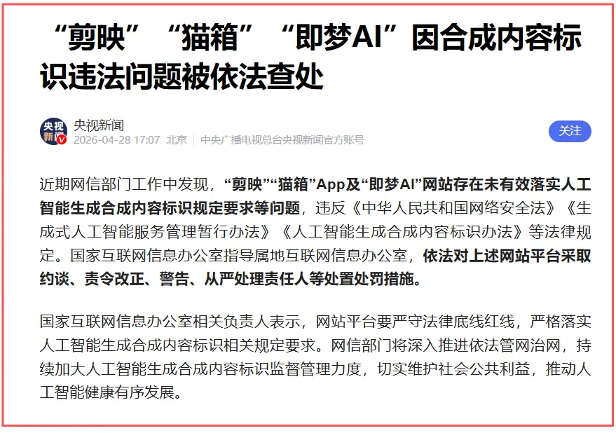 报道称,国家网信办依法约谈了剪映、猫箱App和即梦AI等,不仅给出了严厉警告,还责令它们限期改正,对相关责任人也进行了从严处理。