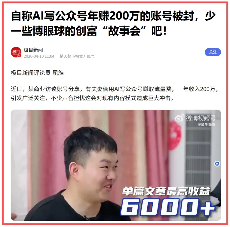 这也是前段时间那个声称用AI写公众号,年赚两百万的博主被封禁的原因之一。
