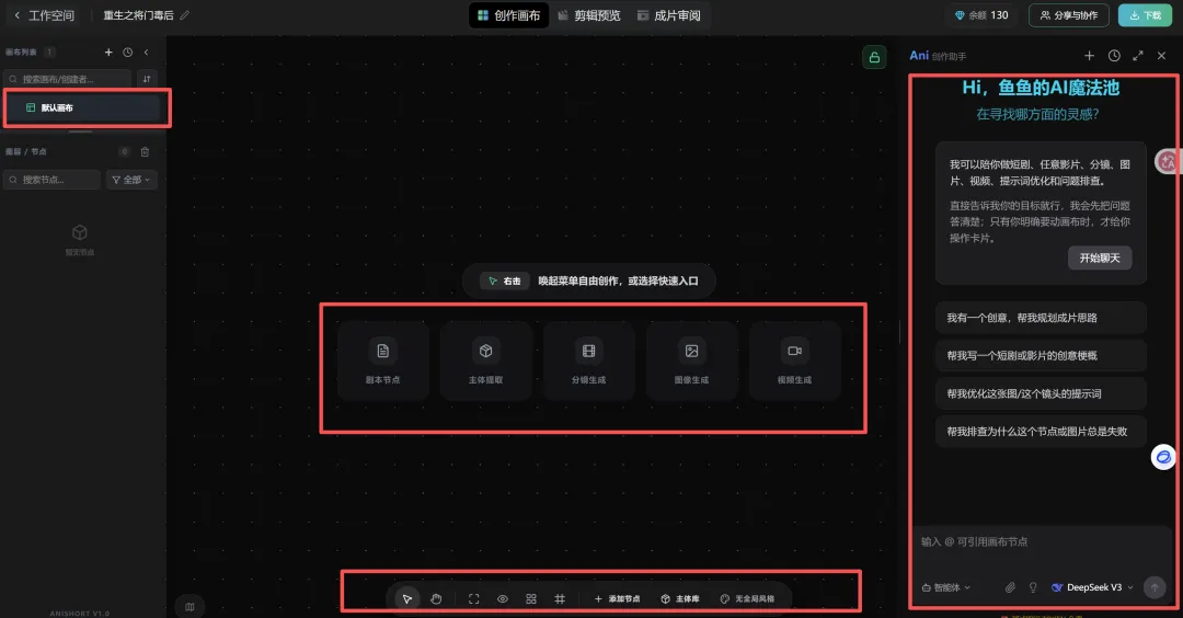 这里进入工作空间,看起来也很像我们熟悉的画布制 AI 创作工具。但是体验下来区别还是挺大的。