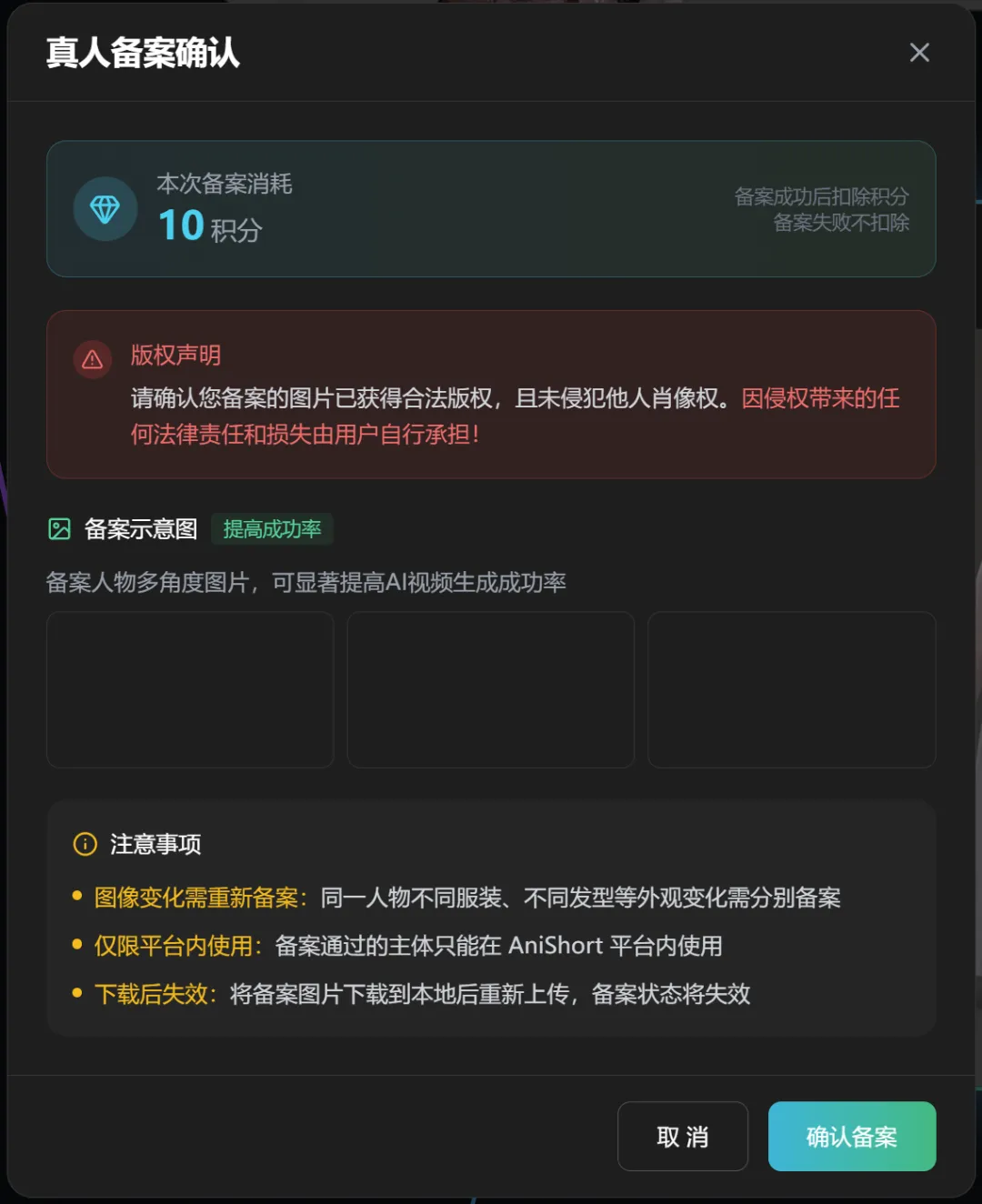 当然,要使用真人素材前需要点击【备案】,通过之后才能制作视频。备案成功,版权在平台也受到保护。