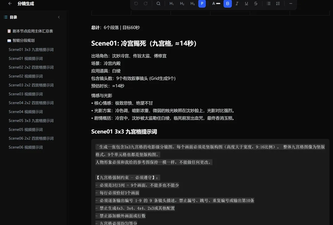 细致到每个镜头的生图提示词+视频提示词,直接完成,一会生图和视频的时候直接可以调用。