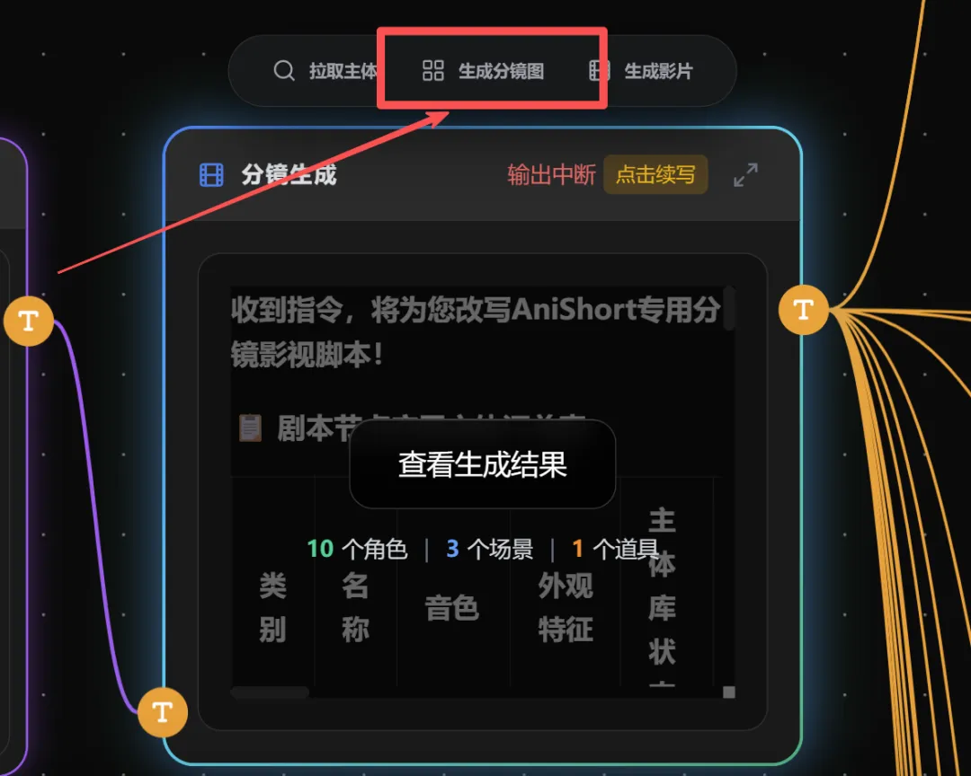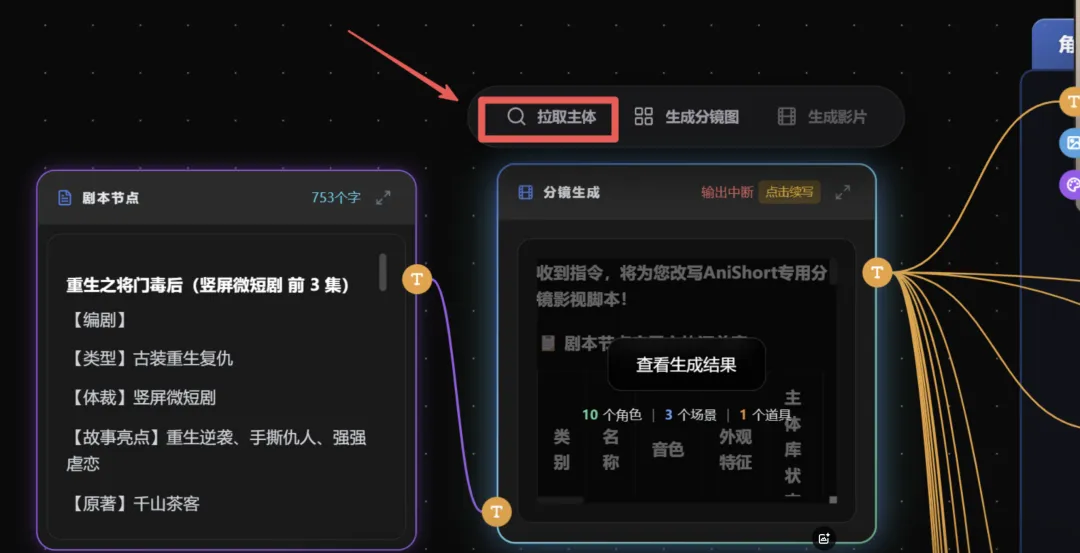 再执行【拉取主体】,根据分镜脚本直接判断这一集出现的人物和场景及道具,并从【主体库】调用到这一集,是不是很丝滑呀?