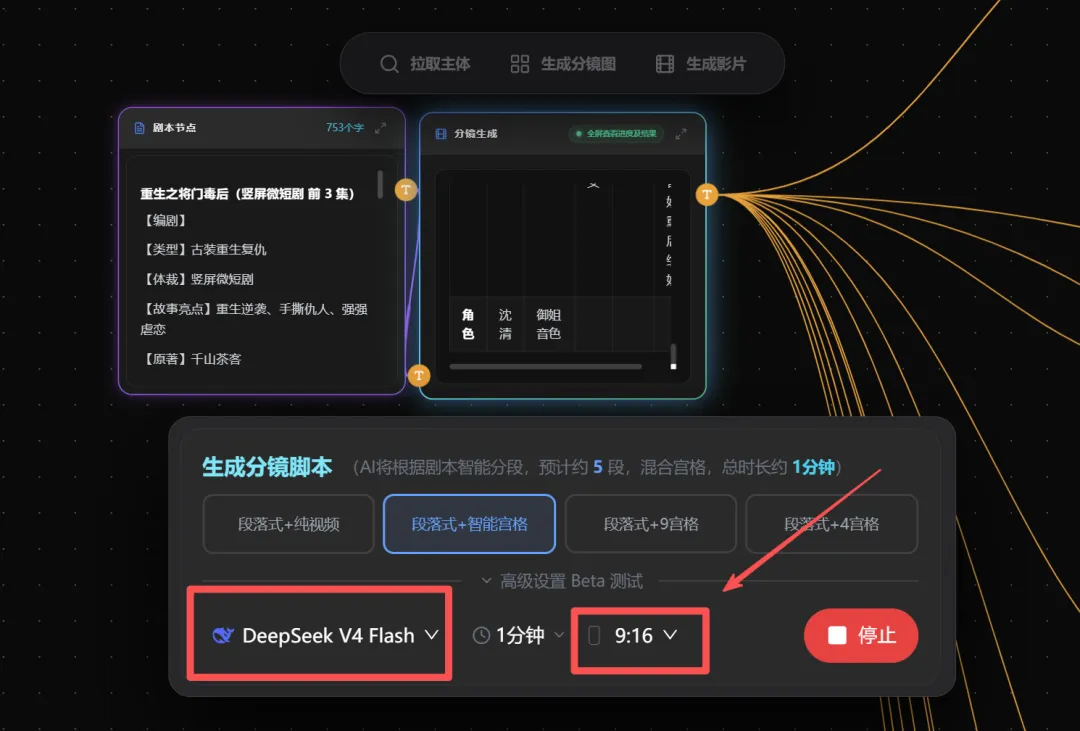 多条线同时跑,加上顶尖模型百路并发生成,九宫格分镜批量直出。