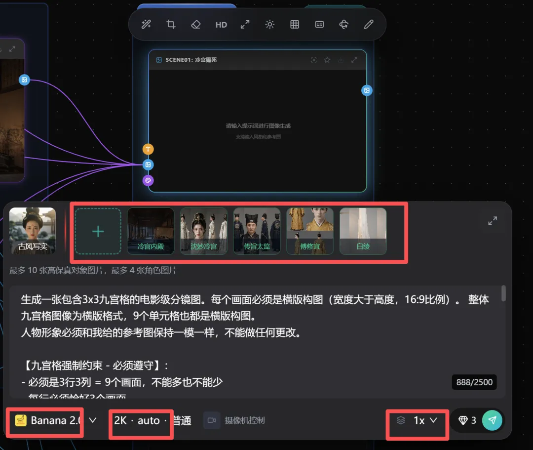 段落式 + 智能宫格:这是最推荐的效率模式。节点会分析你的剧本段落,自动识别每个段落需要几个镜头(短则 1 个,长则 3-4 个),然后把这些镜头合并到一张宫格图里。