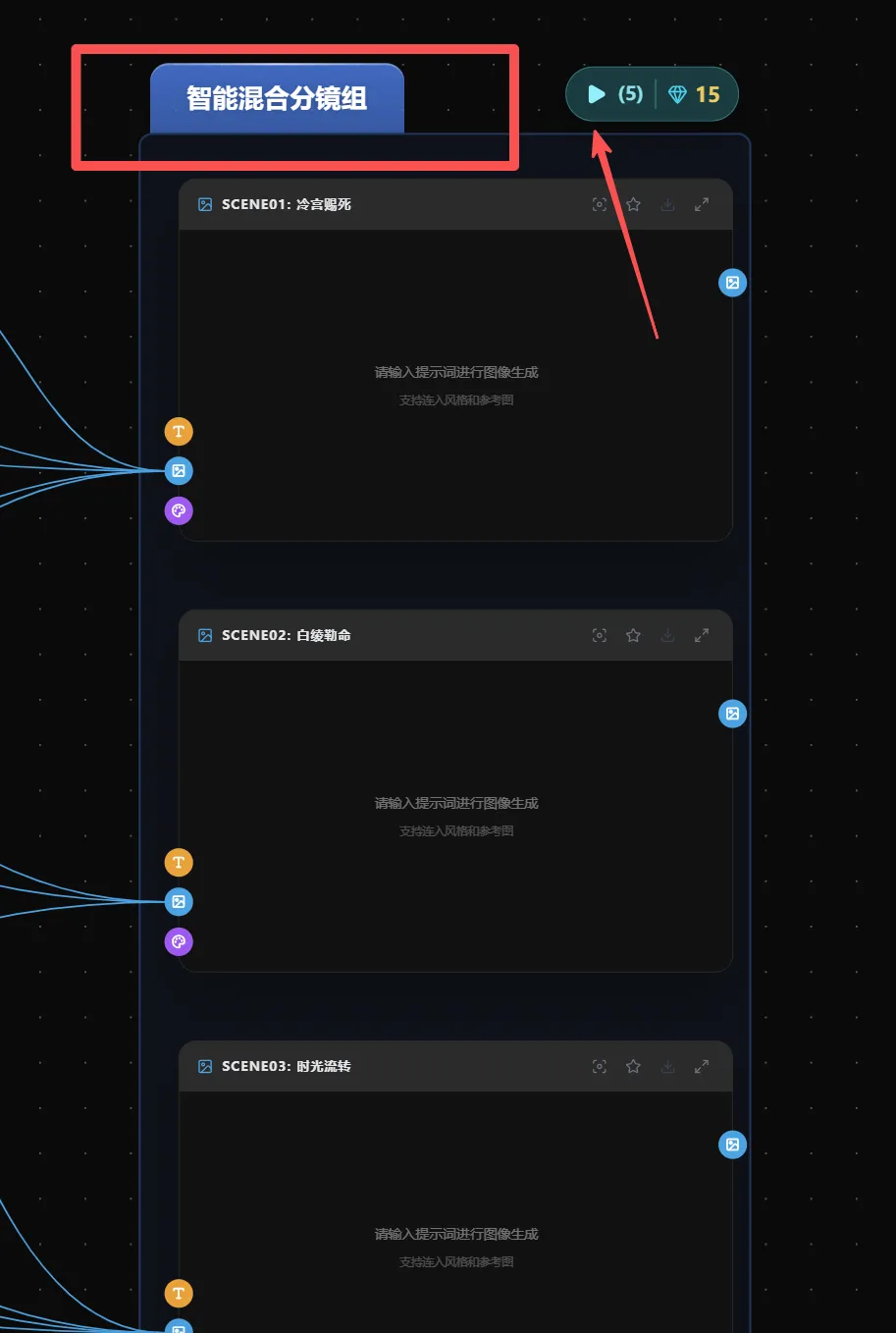 然后可以点击【智能混合分镜组】,一次性批量生成所有的场景分镜。