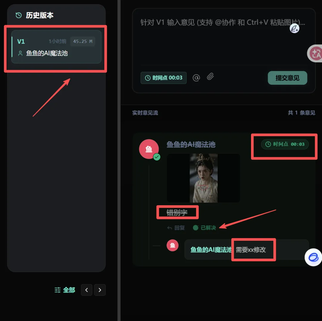 意见可以精准到批注在那一帧上(直接在画面上圈出来打备注)。