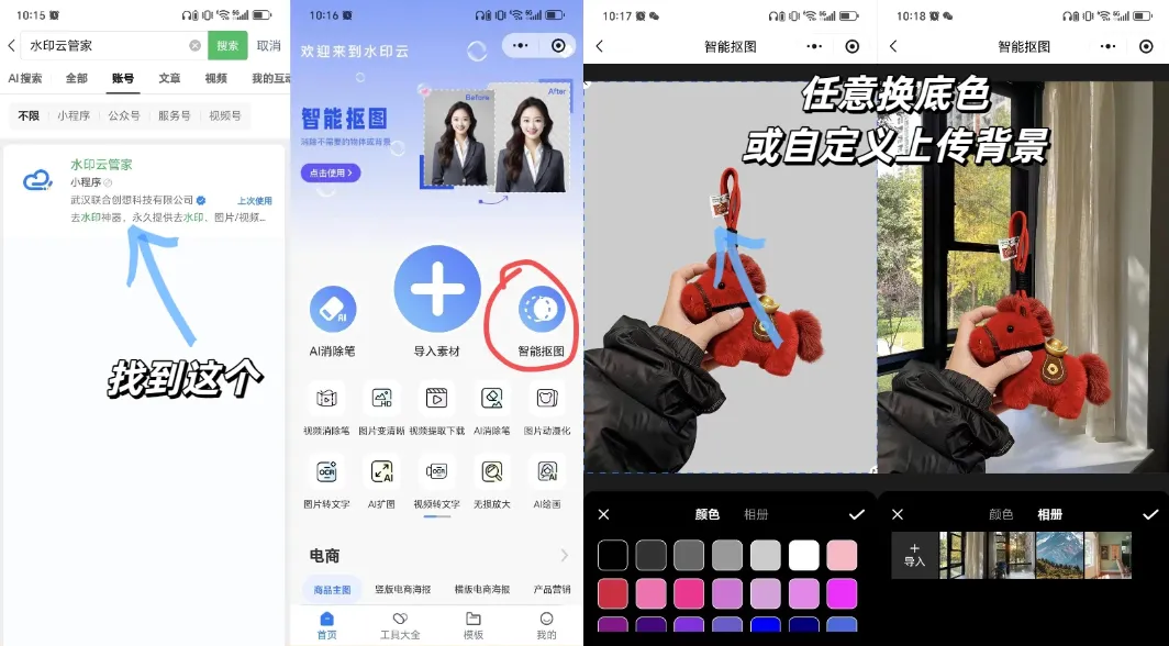 侧重移动端应急:选水印云管家小程序,微信即开即用,本地处理隐私安全,核心抠图效果不打折。