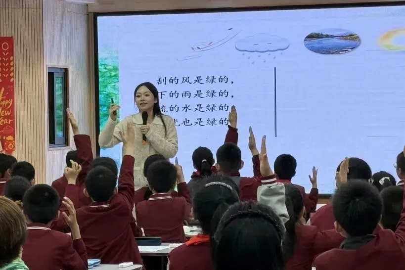 王嘉璇老师执教《绿》,立足本课散文的诗意特质,合理运用AI可视化素材打造沉浸式审美情境,以AI辅助文本品读、画面想象与情感体悟,将抽象的文字意境转化为可感的画面,有效拉近学生与文本的距离。