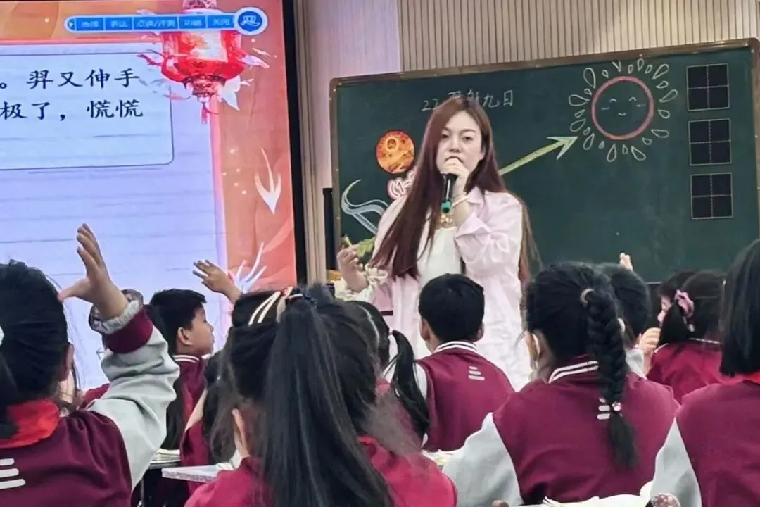 王芙蓉老师执教《羿射九日》第二课时,本课中她依托AI融合教学模式设计全流程教学,借助智能教学平台强化语言表达专项训练,利用智能应答器实现全员互动答题、实时学情统计,同时结合课文情境设计表演环节,搭配AI素材丰富课堂形式,充分调动学生学习积极性,切实提升学生的语言运用能力。