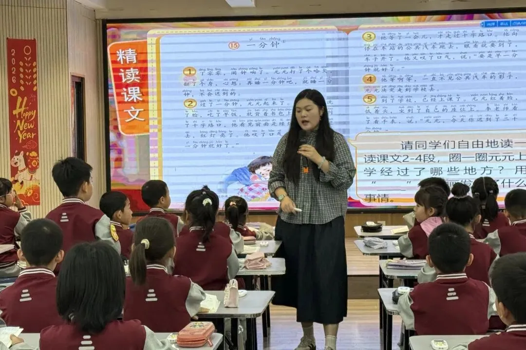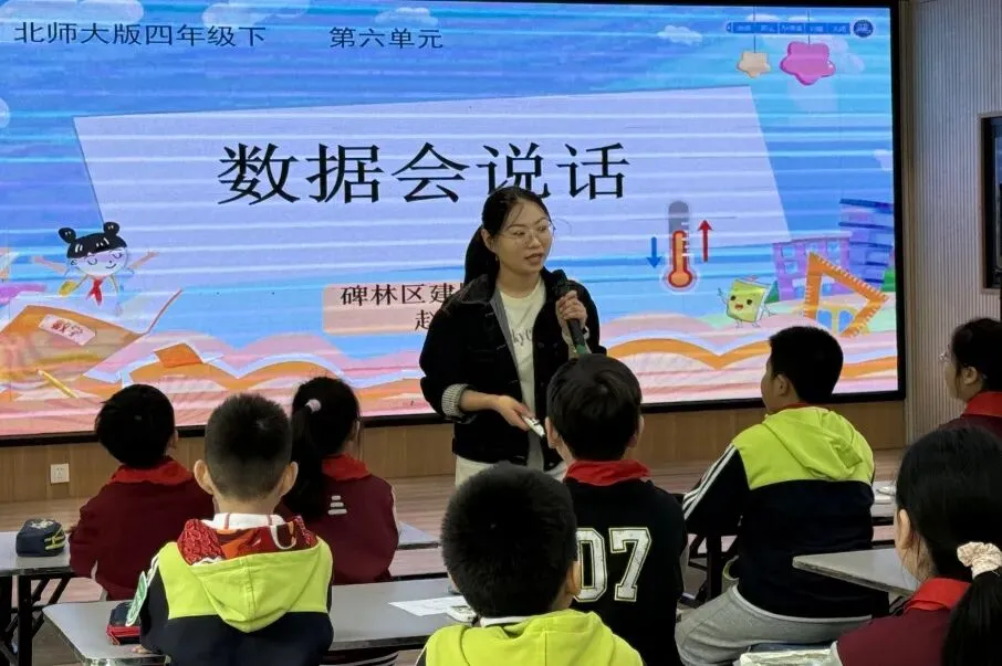 李慧雯老师执教《生活中的大数-整理与复习》,本课中她结合二年级学生的认知特点,借助AI互动工具梳理本课及单元核心复习要点,设计贴合低段学情的趣味答题环节,用轻量化的AI互动降低复习课的枯燥感,让每一位学生都能主动参与课堂、乐在其中。