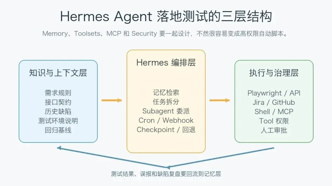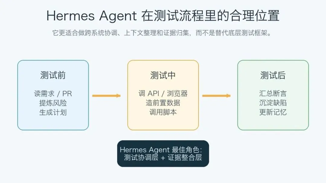 图 1:Hermes Agent 最适合做的是测试前后的协调、执行中的工具调度,以及失败后的证据归集。