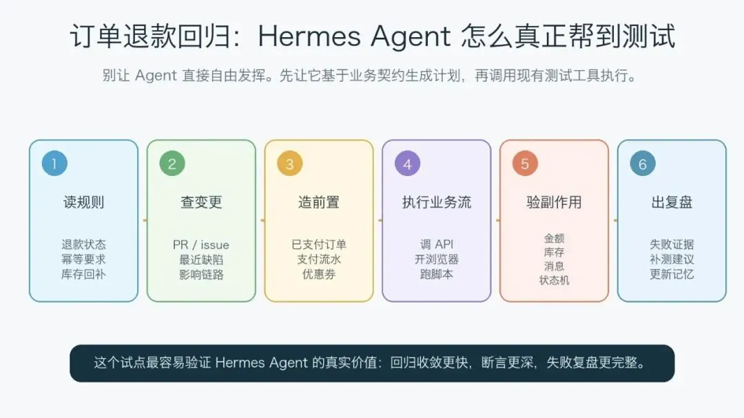 图 3:订单退款非常适合做 Hermes Agent 试点,因为它既有状态流转,也有依赖异常和副作用断言。