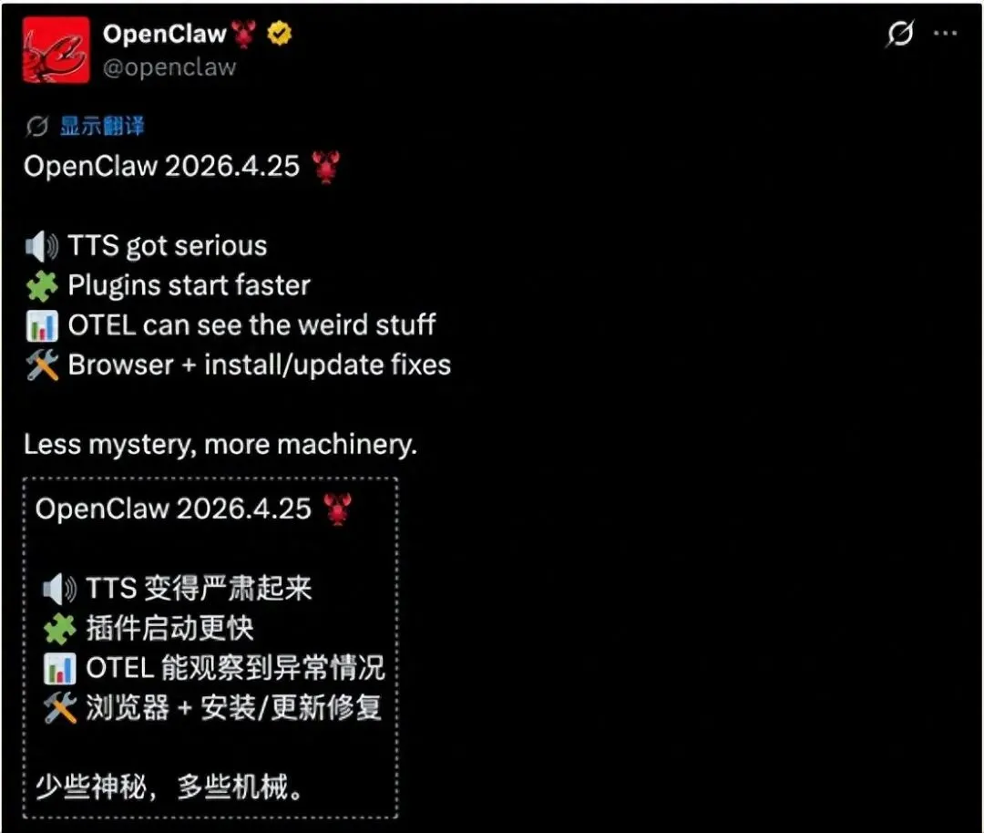OpenClaw v2026.4.25不是追求噱头的版本,却是让工程团队更安心的版本: