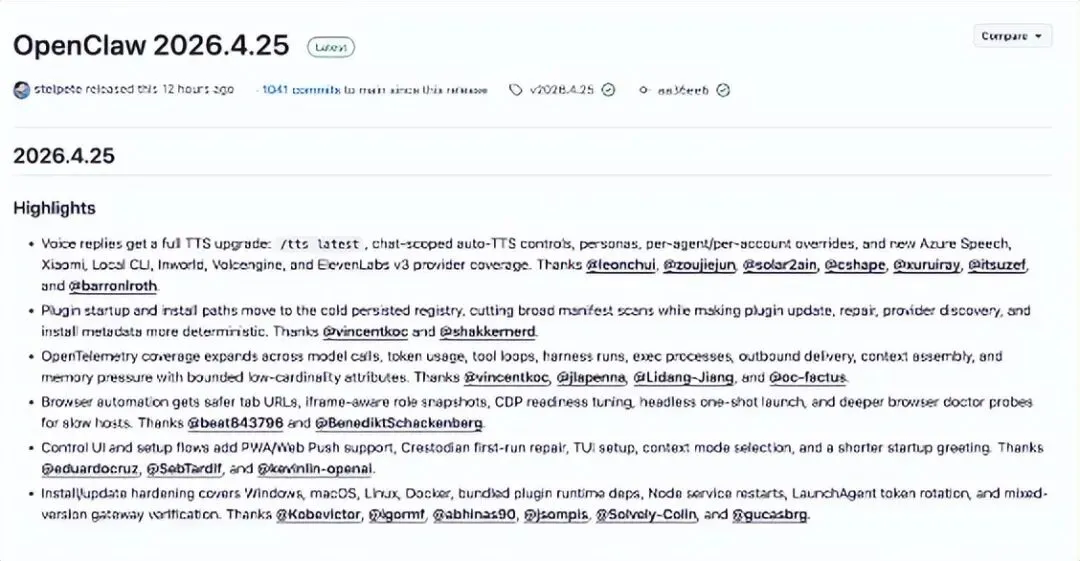 OpenClaw 在 4 月 25 日正式发布了 v2026.4.25 版本