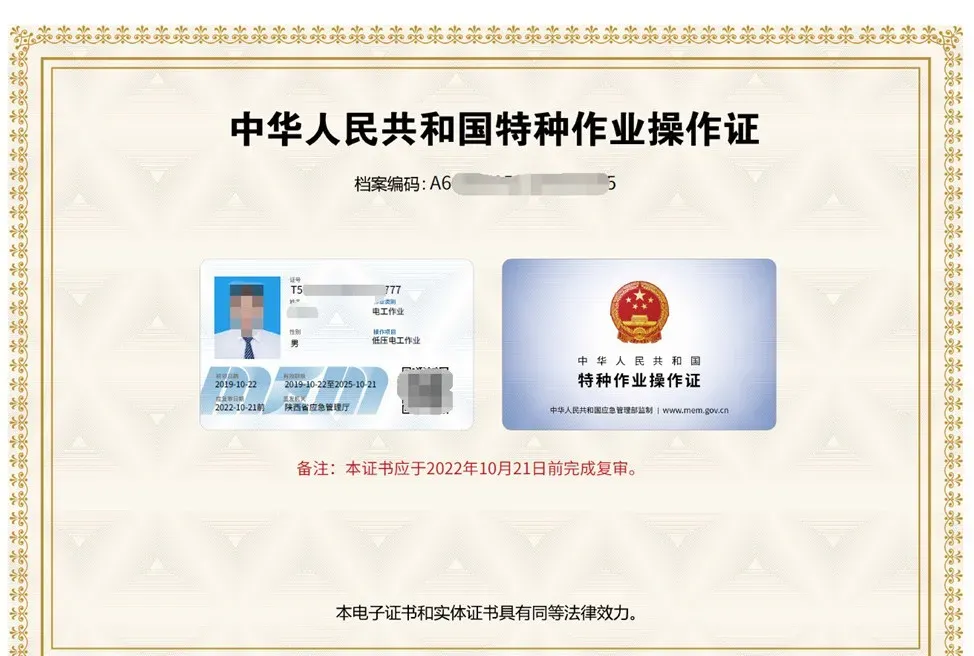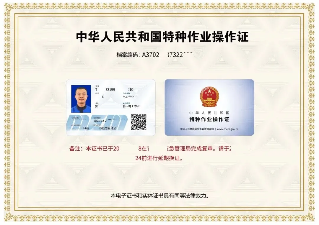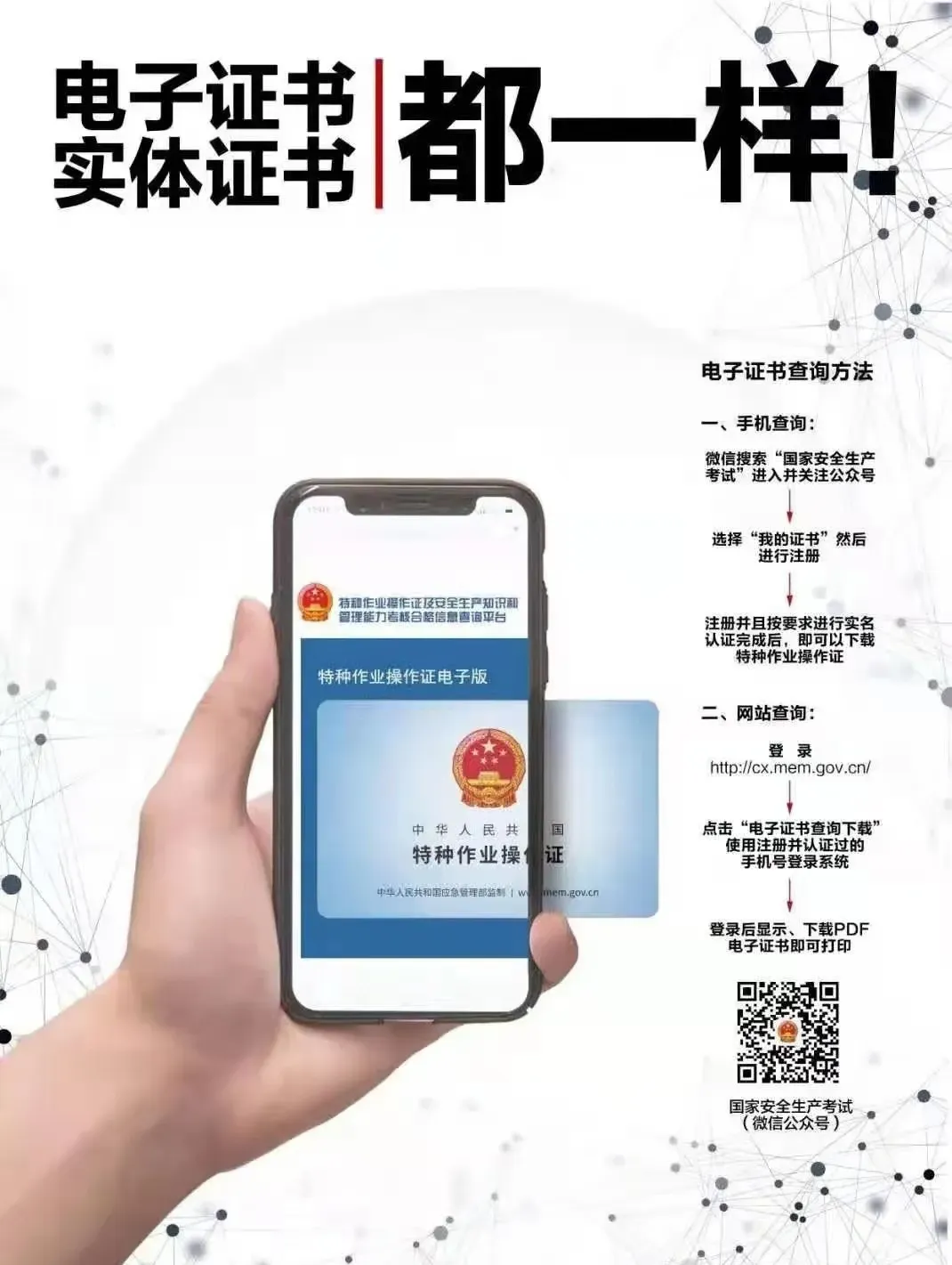 新版特种作业操作证及安全生产知识和管理能力考核合格证分为PVC卡实体证书、电子证书和纸质打印证书,电子证书是实体证书的线上形态,与实体证书具有同等法律效力。