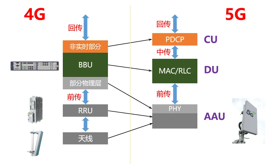 5G时代,架构发生了变化。天线和RRU进一步整合,变成了AAU(Active Antenna Unit,有源天线单元)。而BBU的功能,被拆分为集中单元(CU)和分布单元(DU),分别负责非实时和实时的基带处理任务。