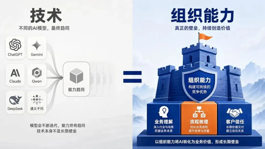 技术是公共资源,迟早会被追平。但你对一个行业的理解、你能帮客户解决的问题、你做出来的闭环系统——这些才是真正的护城河。