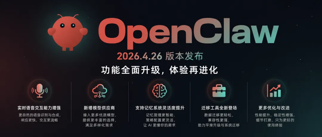OpenClaw 最新版本 2026.4.26 已于 4 月 28 日正式发布,本次更新带来多项重要功能增强与大量稳定性修复,持续提升智能体运行体验。作为 AI 智能体运行平台的重要版本,此次更新覆盖了实时语音交互、模型供应商、迁移工具等多个核心领域。