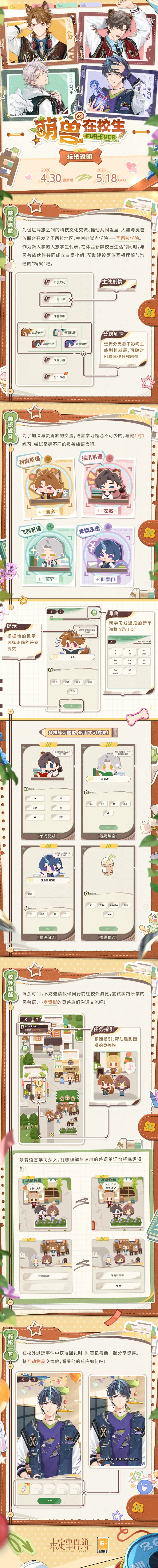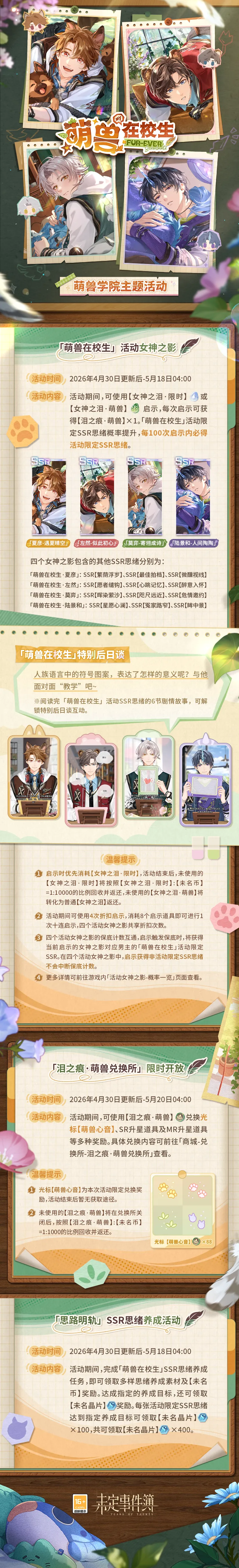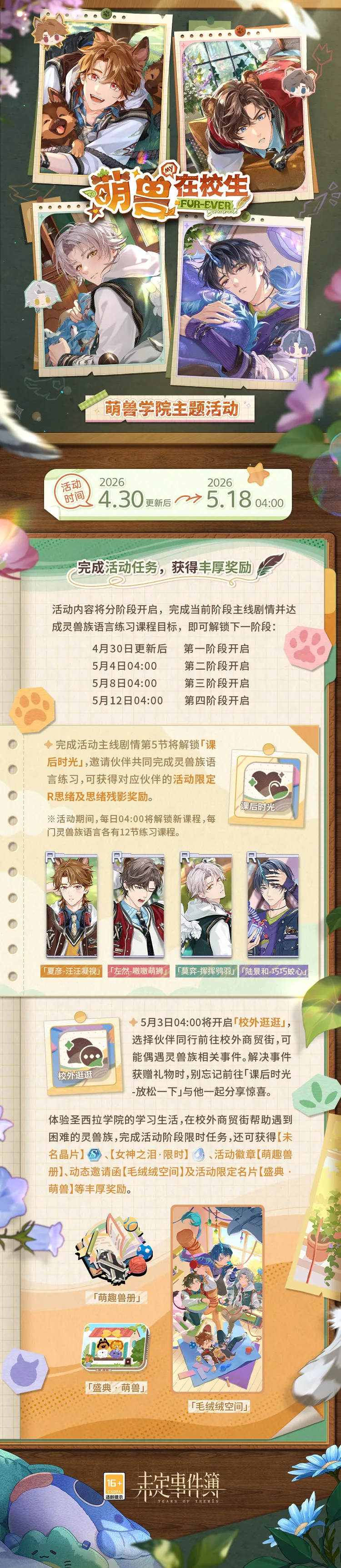 萌兽学院主题活动「萌兽在校生」开放,与灵兽族伙伴一起,体验校园生活,完成兽语练习,即可获得对应伙伴的活动限定R思绪及思绪残影等丰厚奖励