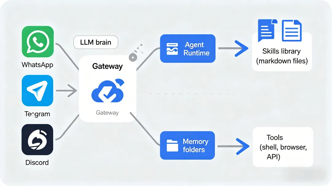 优势:无需学习新 App,所有交互都在你日常使用的聊天软件里完成。Gateway 统一处理消息的接收、验证、路由和回复,支持多路并发和消息队列,确保稳定可靠。