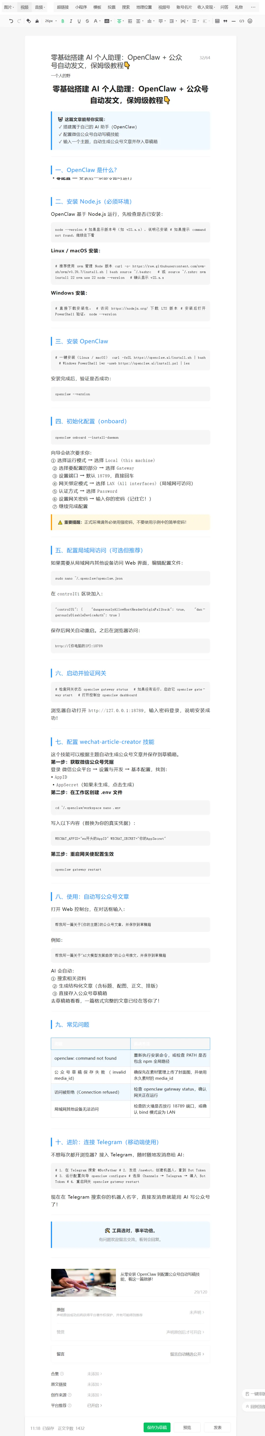 例如让他写一篇openclaw的保姆级教程,此图只是测试写作能力,只有当输入公众号等关键词时才会推送到公众号草稿中。