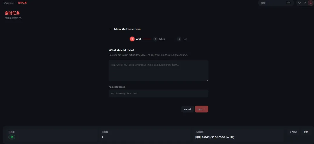 自主运行模式:开启 cron heartbeat 后,Agent 可在没有实时指令的情况下,定期检查任务并主动执行。