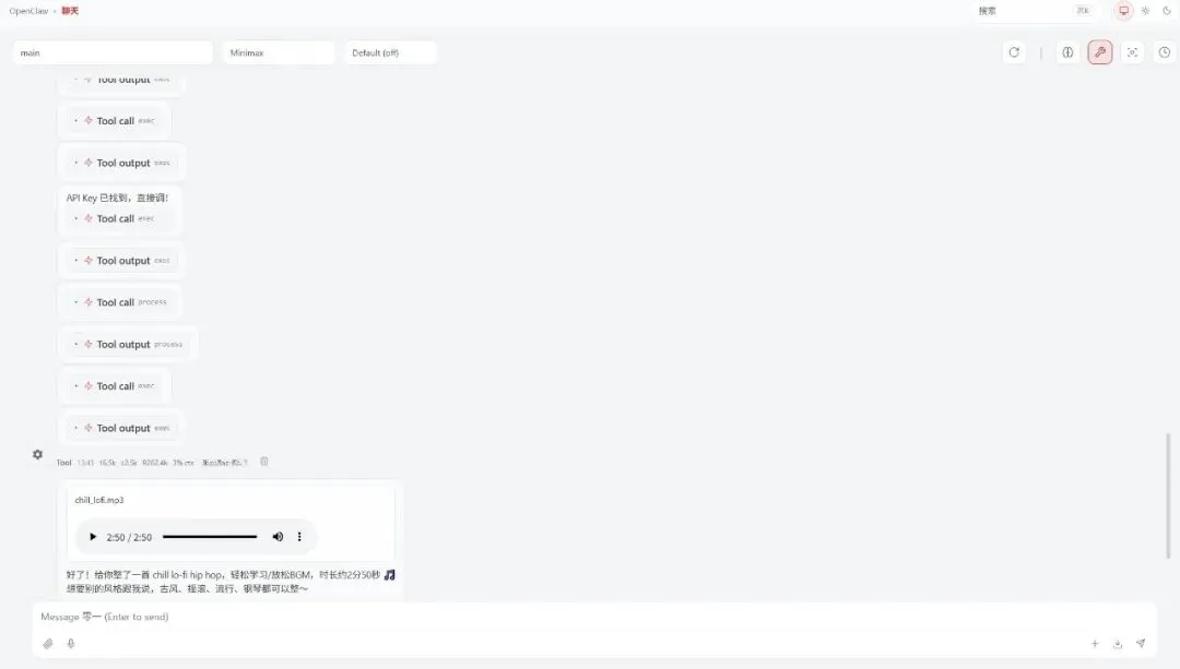 另外,我还安装了minimax-music技能。当文章需要配背景音乐时,我会直接指令:“用 minimax-music 生成一段轻快励志的电子音乐,30 秒左右,适合放在公众号文章开头”,Agent 很快就能生成音乐并返回下载链接,极大提升了内容生产的效率和完整度。