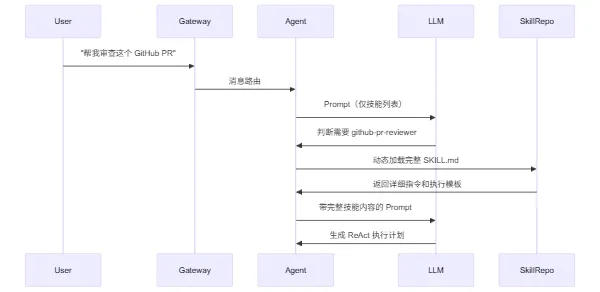 1.按需加载(On-demand):基础 Prompt 只包含所有已安装技能的名称和一句话简述。当 Agent 判断需要某个具体技能时,才动态加载该 Skill 的完整 SKILL.md 内容,大幅节省上下文令牌。 -