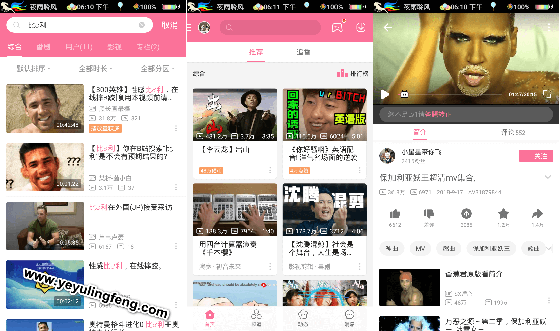 哔哩哔哩动画简称B站,青少年使用较多的网站之一,因为对二次元、追番、漫画、ACG等新生词汇的不够了解,至今都不到该把B站归为哪一类网站,毕竟直播、弹幕、鬼畜、新番这些新鲜元素都有涉及,对于门外汉的老夜实在是有些理解困难,至今都没能通过让人抓狂的转正考试,唯一接触过的就是比♂利、哲学之类的。此次分享的是基于客户端修改后的版本,已去除广告以及版权限制限制,可以更换各种主题。