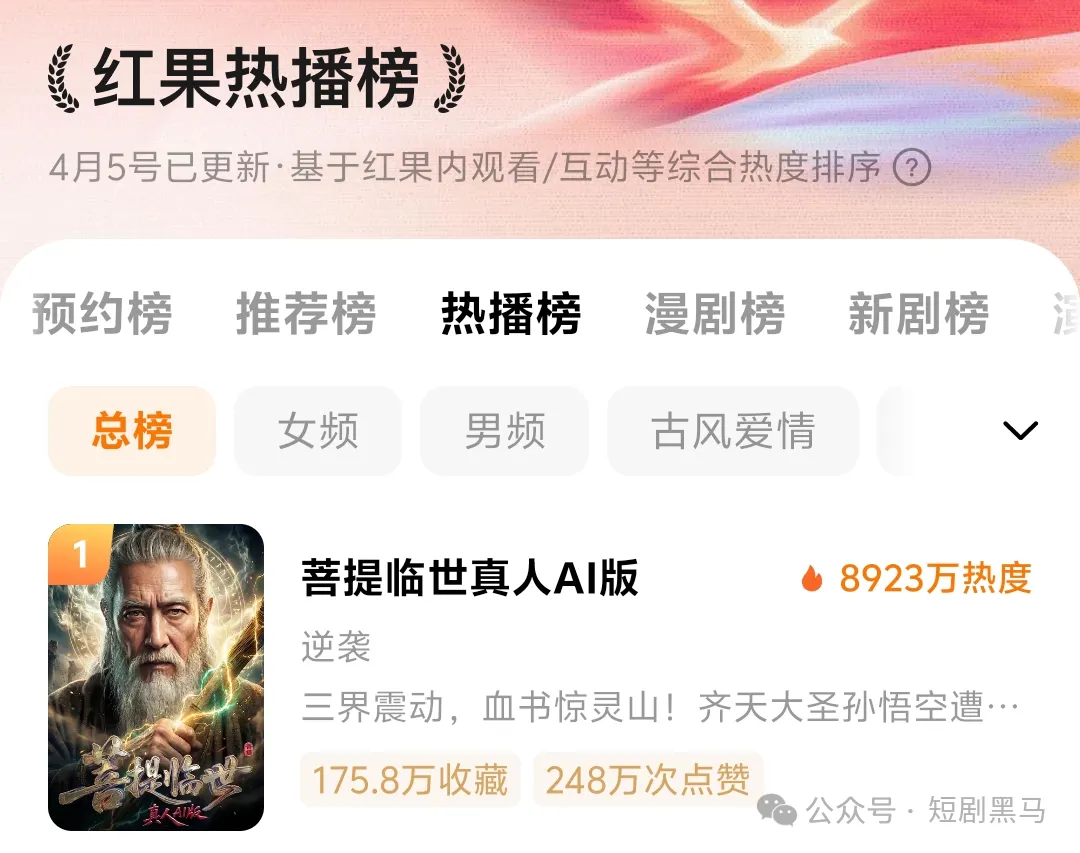 2026年4月5日,AI短剧迎来历史性的一刻——《菩提临世AI真人版》登顶红果平台热度榜第一,首次断层超过真人短剧的热度。