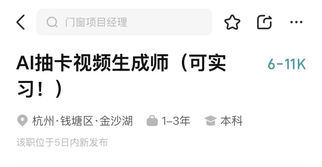 另外,AI短剧行业在淘汰旧岗位的同时,亦带来新兴岗位,例如AI抽卡师——根据提示词在AI视频软件中生成角色、视频。目前,该岗位面临大量空缺,招聘软件上,杭州地区的抽卡师岗位薪资标注6-10k,约是动漫行业中初级动画师的薪资。
