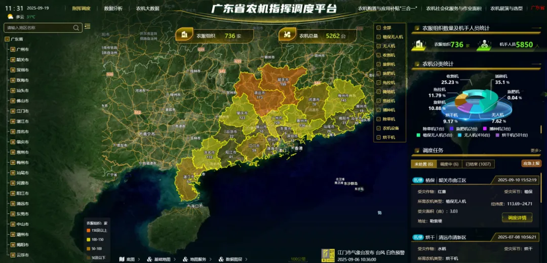 过去,丘陵山区农机“不好用、调不动、管不来”曾是普遍痛点。如今,广东省农机指挥调度平台构建起省、市、县三级联动的综合性农机管理与服务体系,实现“统计、监管、调度、服务”全流程闭环。无论是日常作业监管,还是应急抢收、救灾复产,均可“一屏统览、一键调度”。