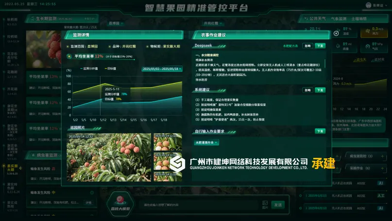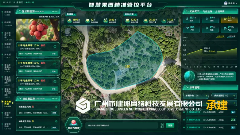 智慧果园“大脑”——智慧果园精准管控平台,针对不同品种实施“一树一策”。无论是桂味、糯米糍的精细促花,还是仙进奉、井岗红糯的精准保果,系统都能依据每棵果树的实时状态,推送个性化农事方案,并调度无人机、无人车等农机高效协同作业。