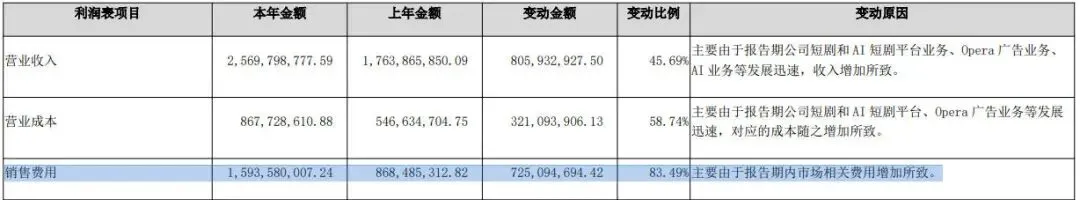 其次,为赋能短剧和AI短剧平台业务及AI音乐、AI SuperAgent、AI社交等产品的用户获取与增长,公司加大市场推广与流量投放力度,全年销售费用41.82亿元,同比增长81.53%。两项战略性投入短期内推高运营成本,导致公司当期利润承压。