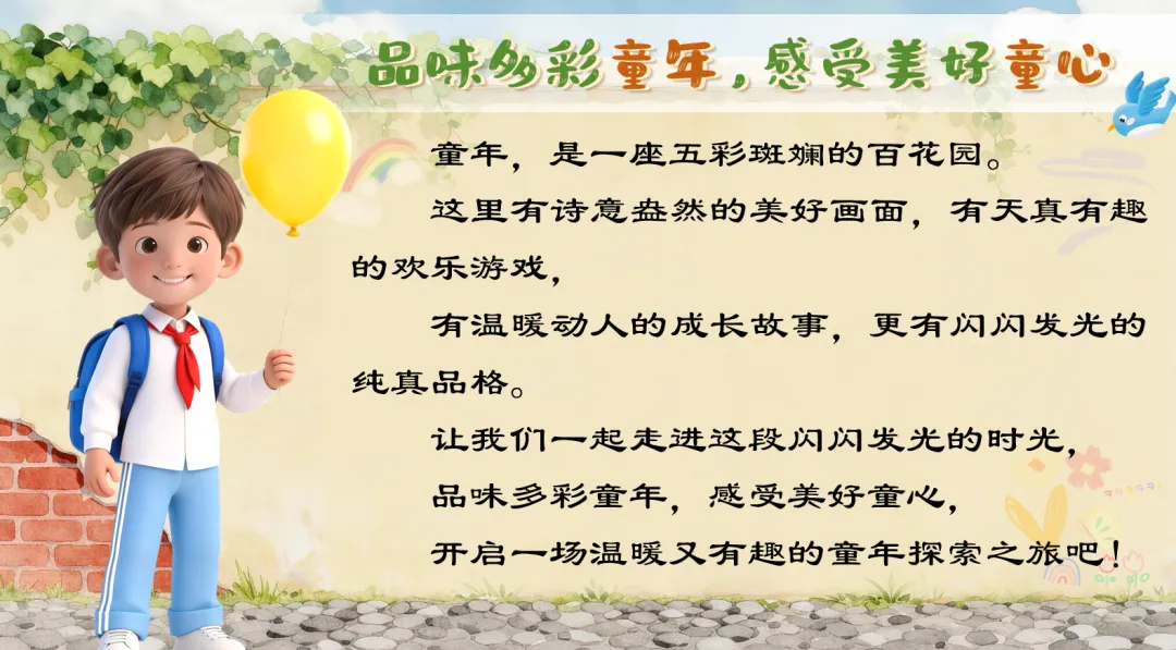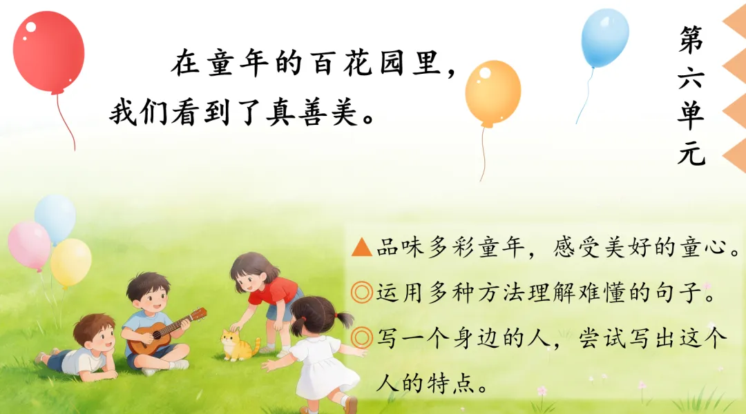 (p1)单元情境导入:童年,是一座五彩斑斓的百花园。这里有诗意盎然的美好画面,有天真有趣的欢乐游戏,有温暖动人的成长故事,更有闪闪发光的纯真品格。让我们一起走进这段闪闪发光的时光,品味多彩童年,感受美好童心,开启一场温暖又有趣的童年探索之旅吧!