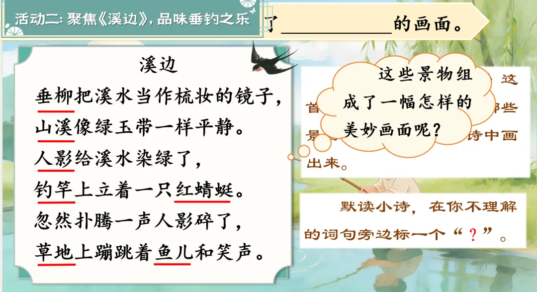 (p10)活动二:聚焦《溪边》,品味垂钓之乐。